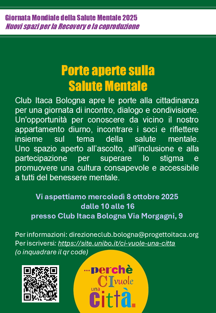 In occasione del Mese della Salute Mentale, Progetto Itaca Bologna invita la cittadinanza a una giornata speciale di incontro, dialogo e condivisione all’interno del nostro Club, il nostro appartamento diurno dedicato al supporto e al reinserimento sociale di persone con una storia di disagio psichico.